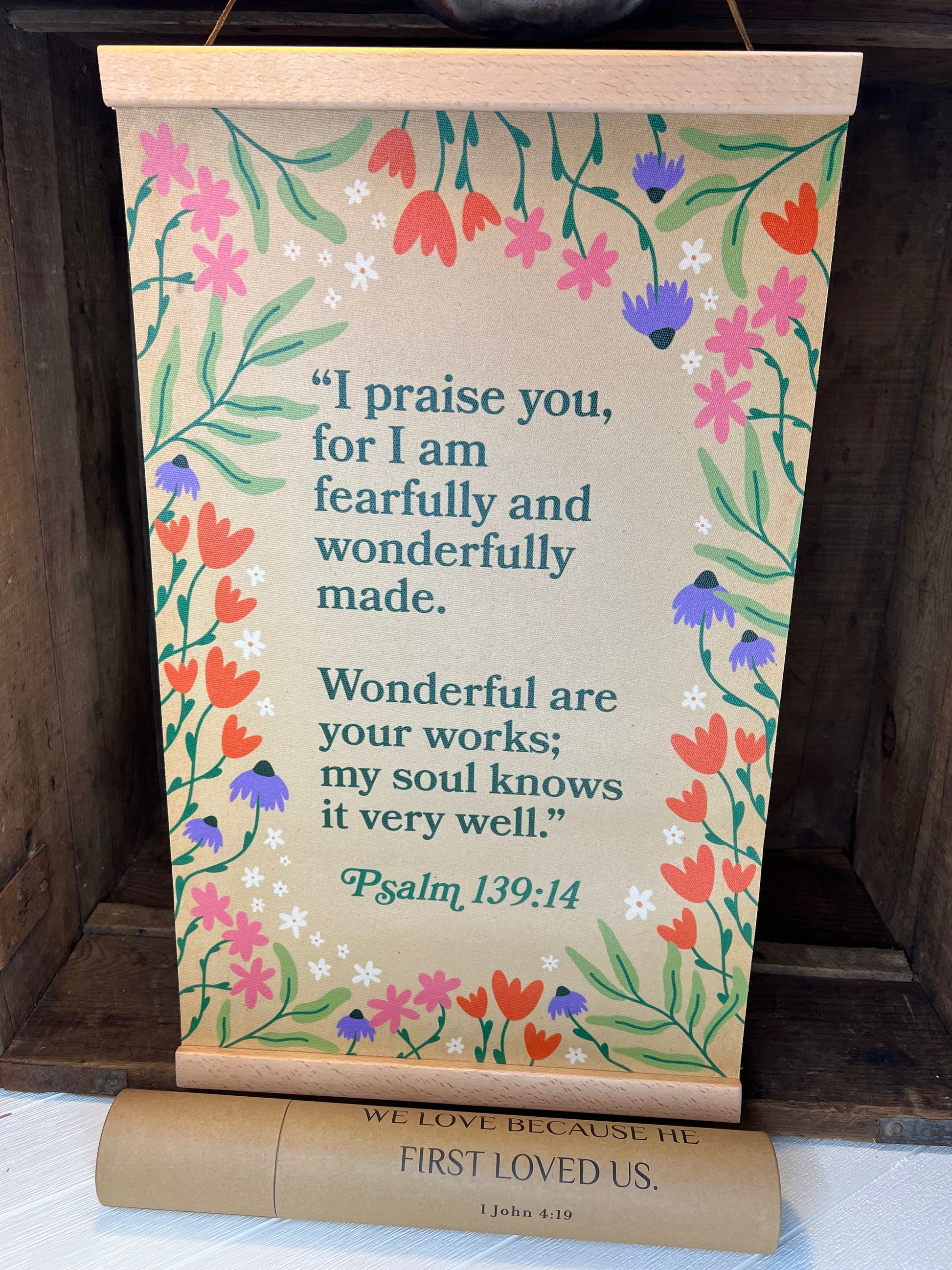 Your wall hanging is carefully rolled and shipped in a sturdy kraft mailing tube featuring the verse “We love because He first loved us – 1 John 4:19.”